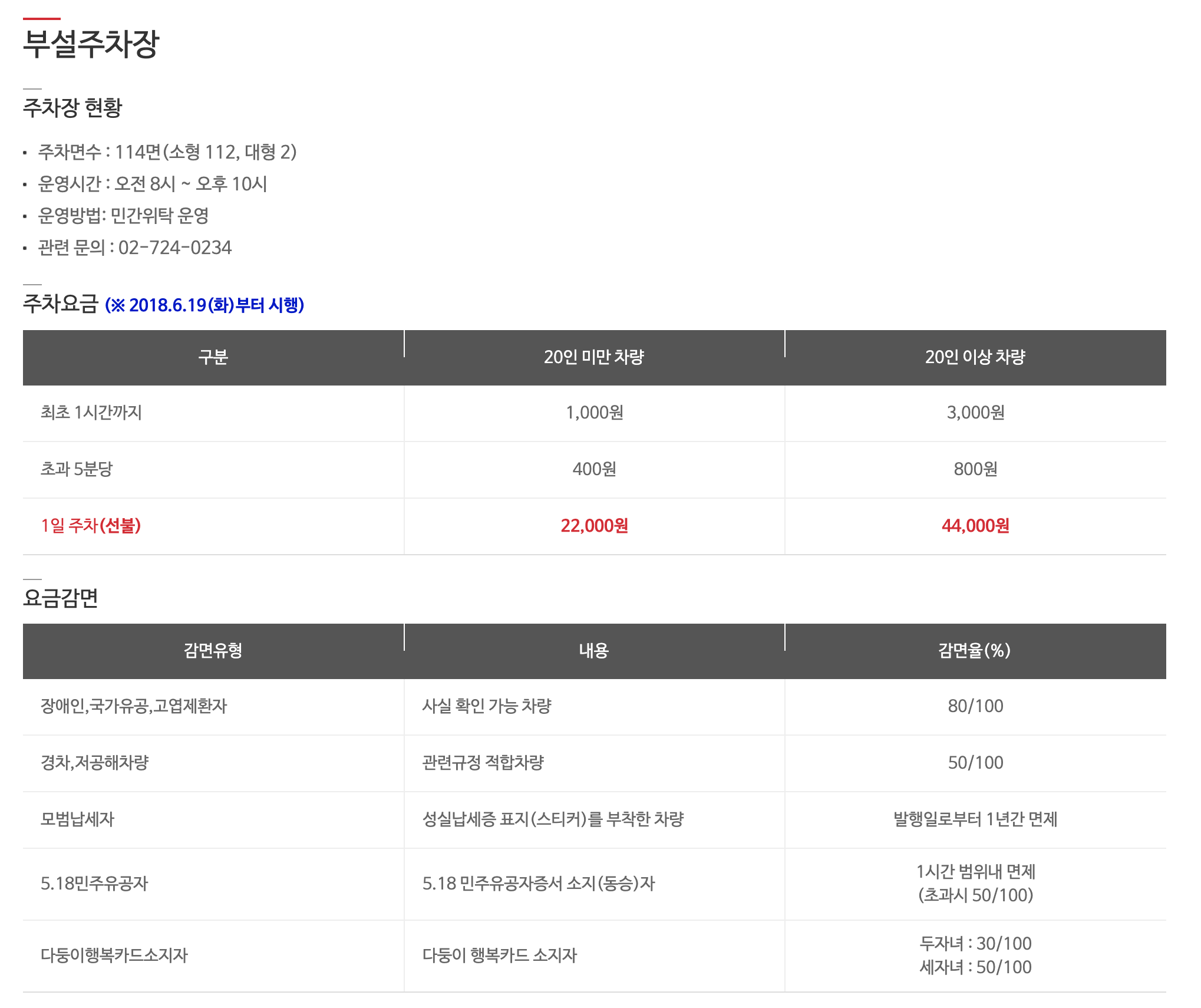 - 대형(20인 이상): 최초 1시간까지 3,000원 / 초과 5분당 800원 / 1일주차(선불) 44,000원