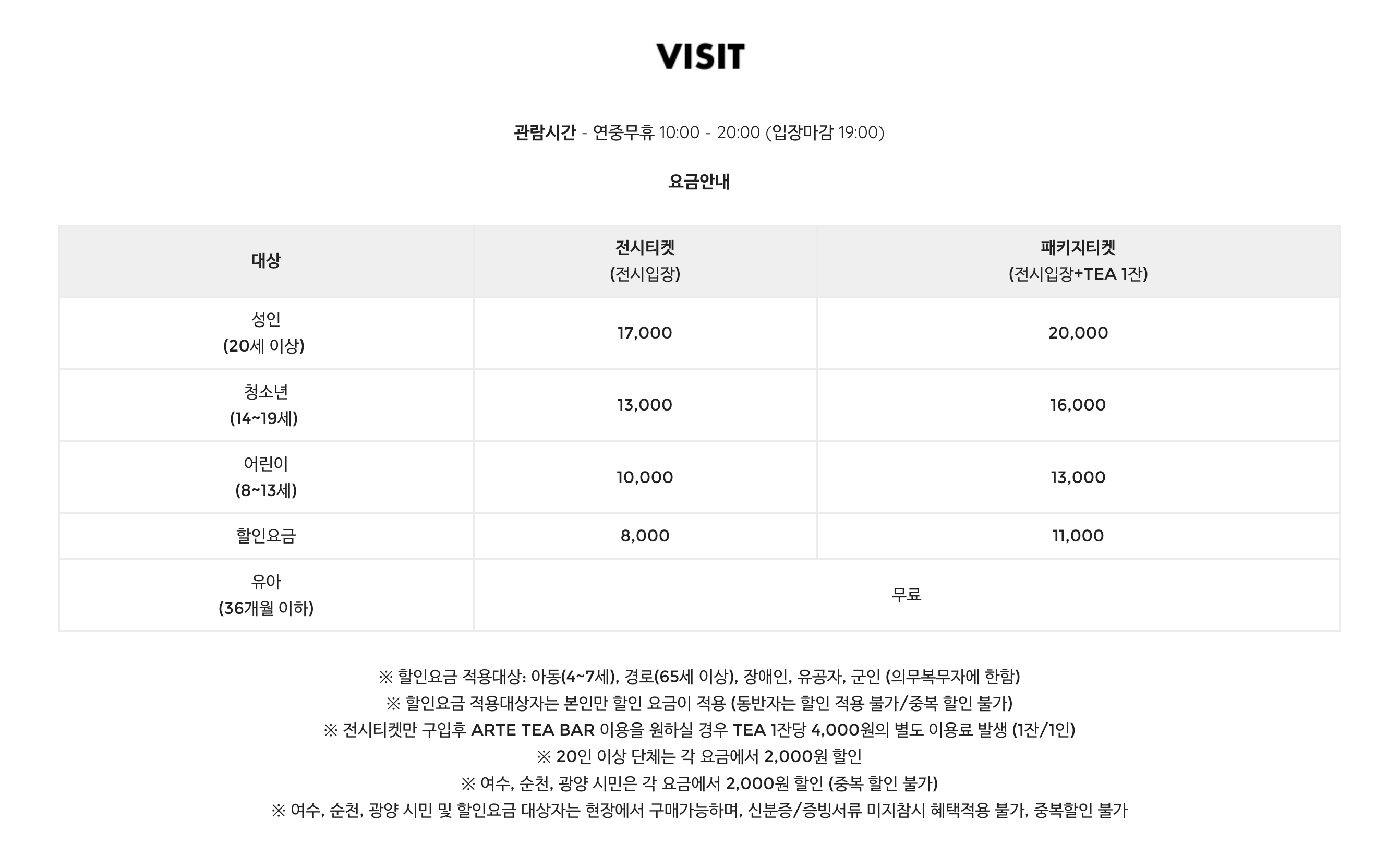 - 패키지티켓(전시입장+차 1잔): 성인 20,000원 / 청소년 16,000원 / 어린이 13,000원