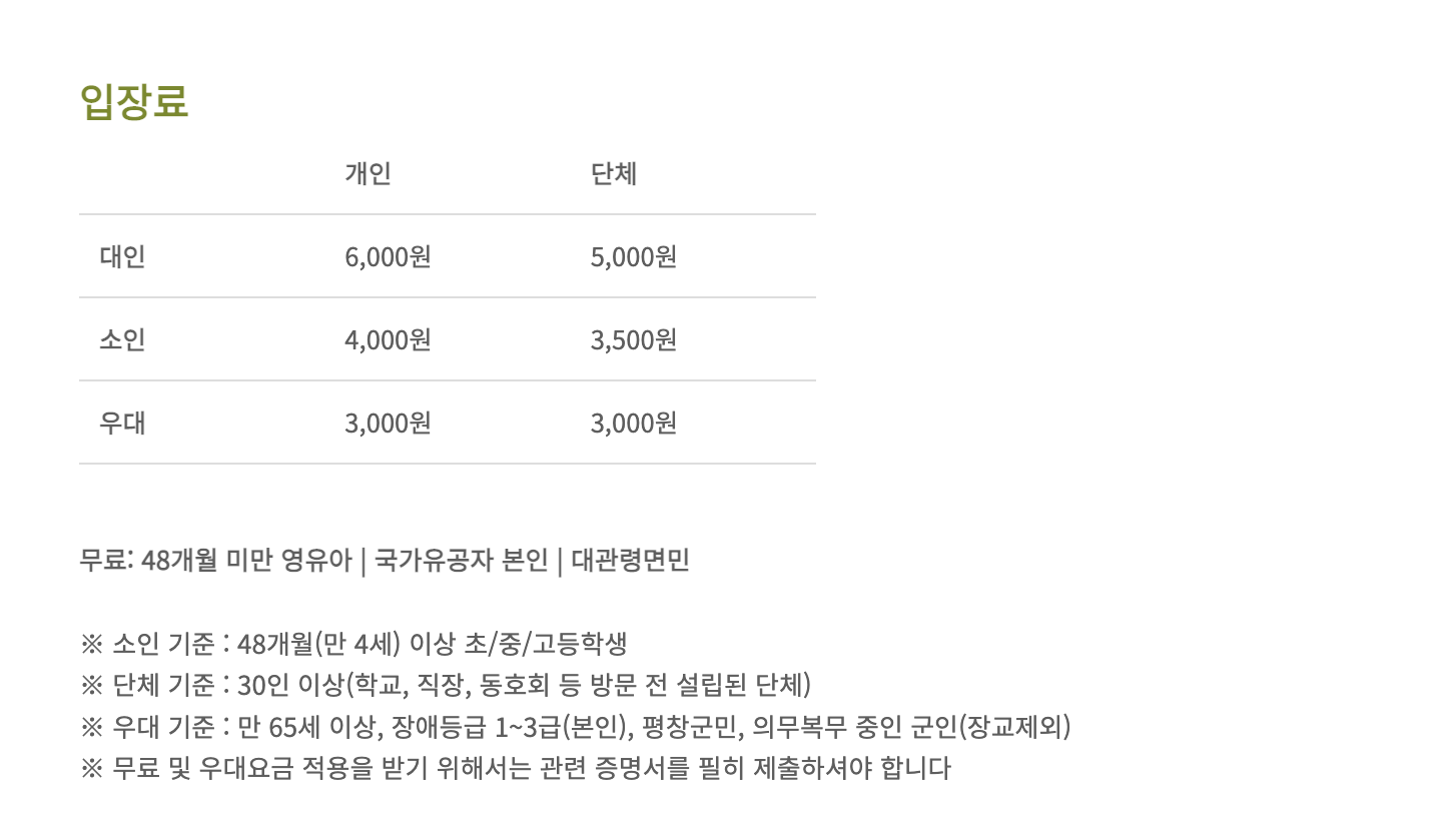- 무료: 48개월 미만 영유아, 국가유공자 본인, 대관령면민