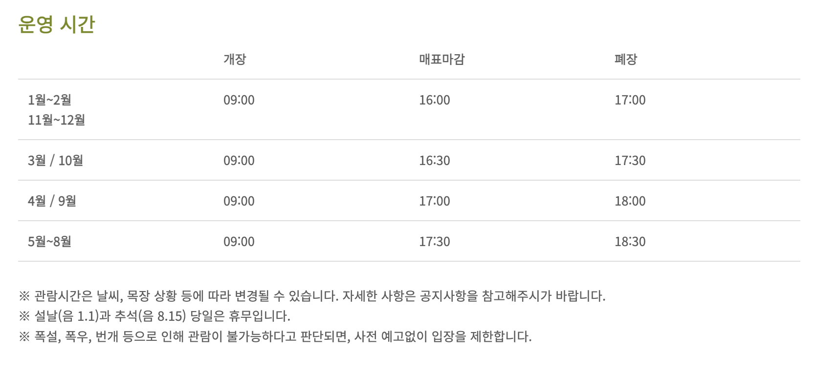 운영시간은 계절에 따라 차이가 있습니다.