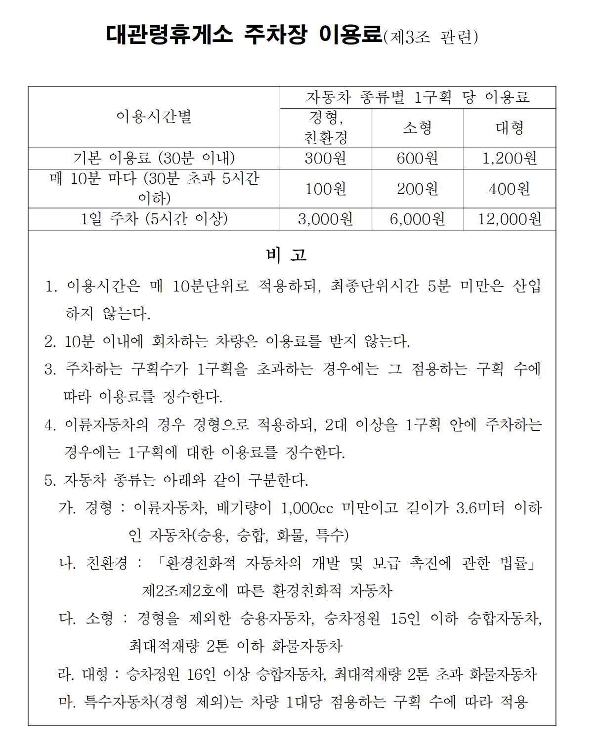 - 경형, 친환경: 30분 이내 300원, 초과시 10분마다 100원, 1일 3,000원(5시간 이상)