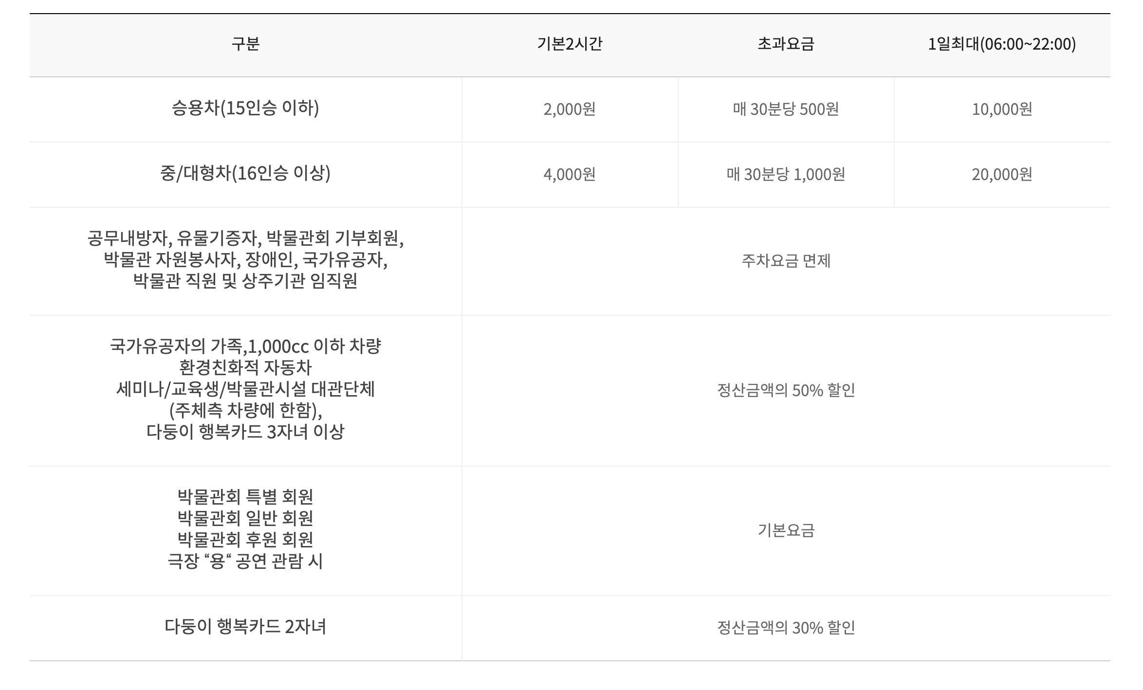 - 승용차(15인승 이하): 기본 2시간 2,000원 / 초과시 30분마다 500원 / 1일 최대 10,000원(06:00~22:00)