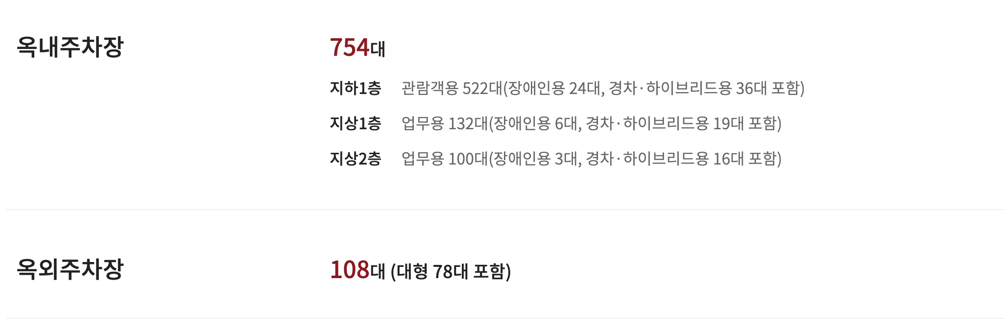 - 지하 1층 522대(관람객용), 지상1층과 지상2층에 232대 (업무용) / 옥외주차장에 108대 주차 가능합니다.