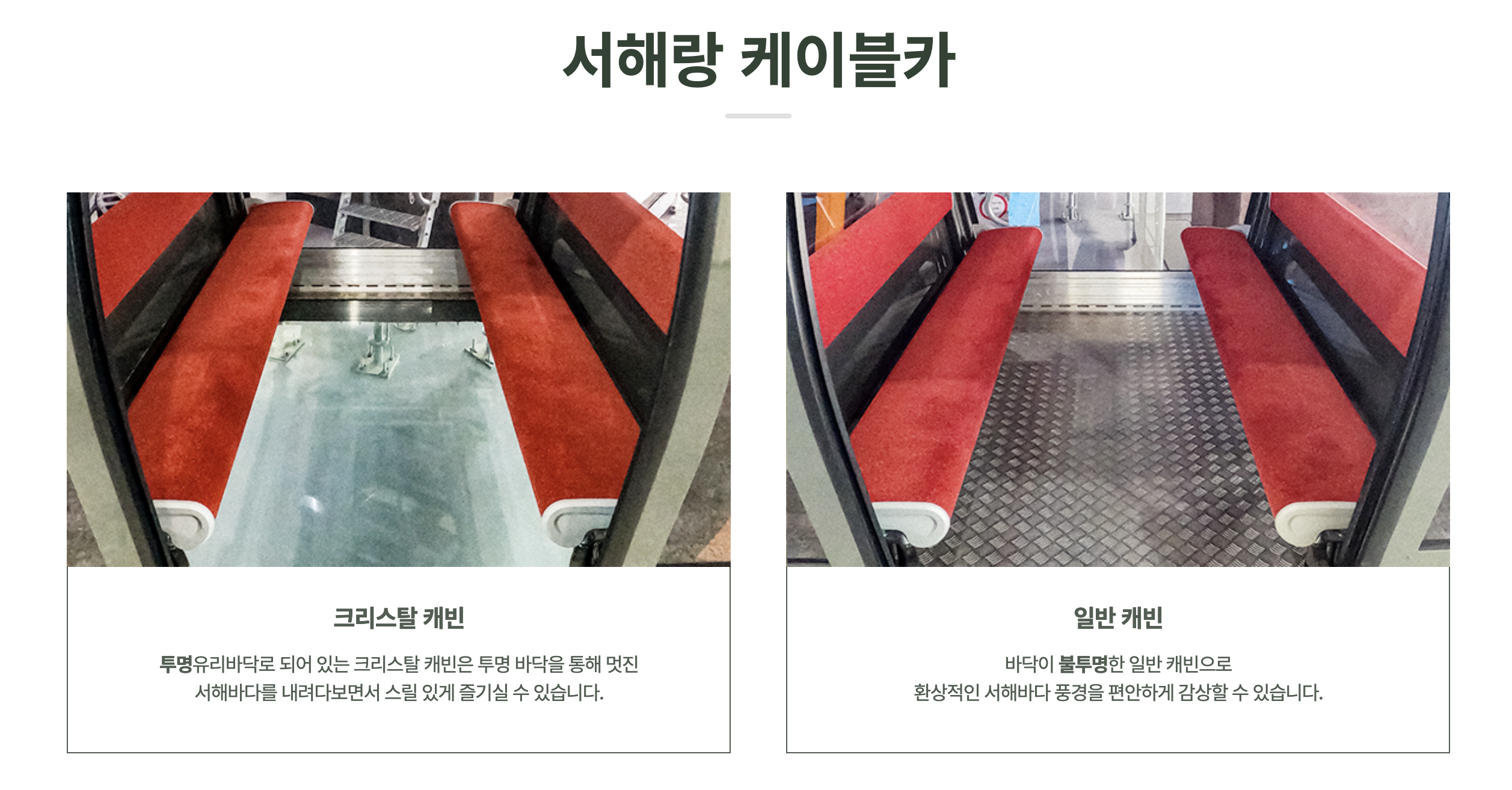 - 서해랑 케이블카에는 두 종류의 캐빈이 있습니다.
